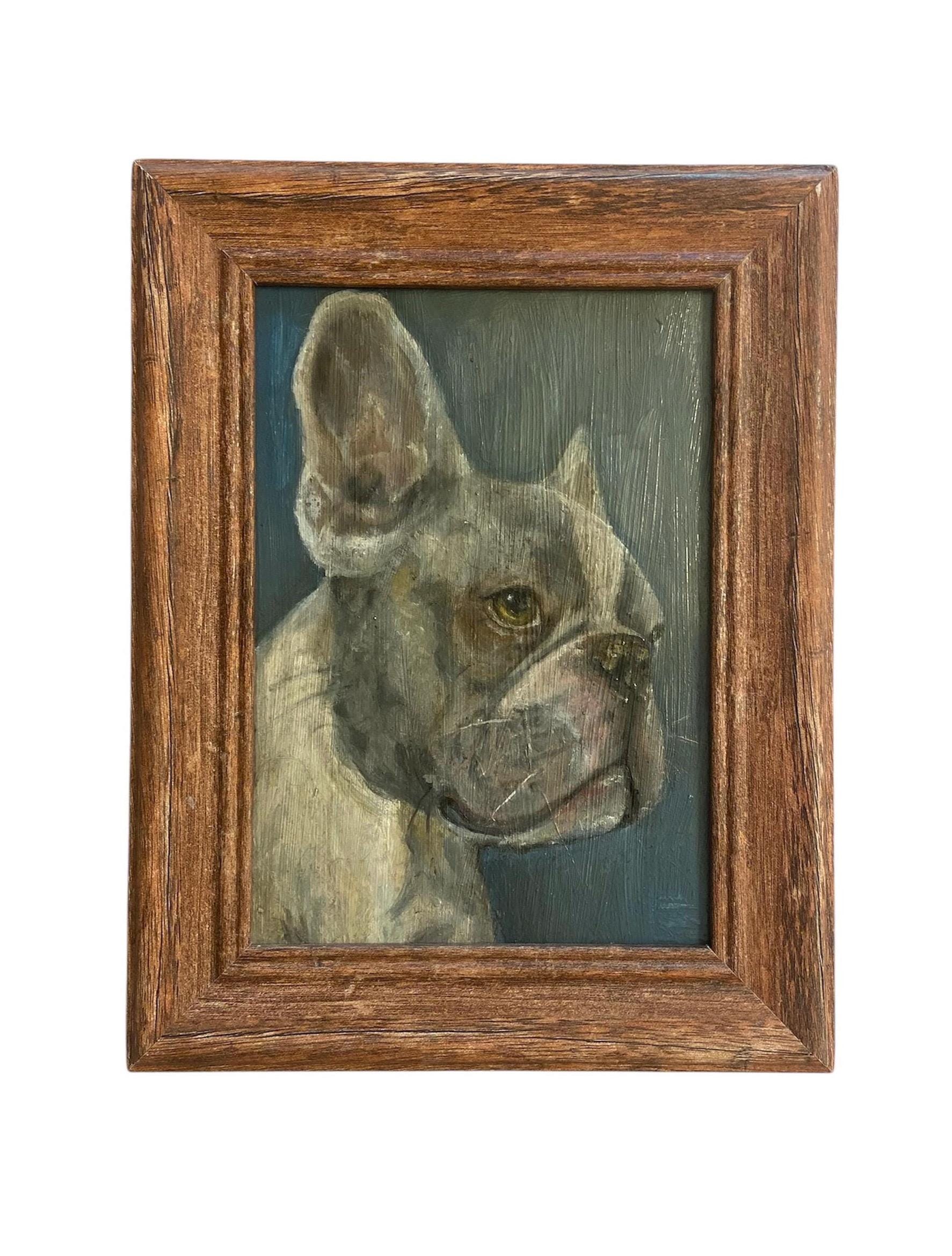 Faux Frenchie Oil Painting Print with blue background. Professionally printing on high-quality fine art paper, canvas, or metal. Perfect for anyone looking for elegant home decor. Add this beautiful piece to your collection of gift it to someone special.