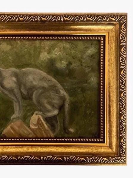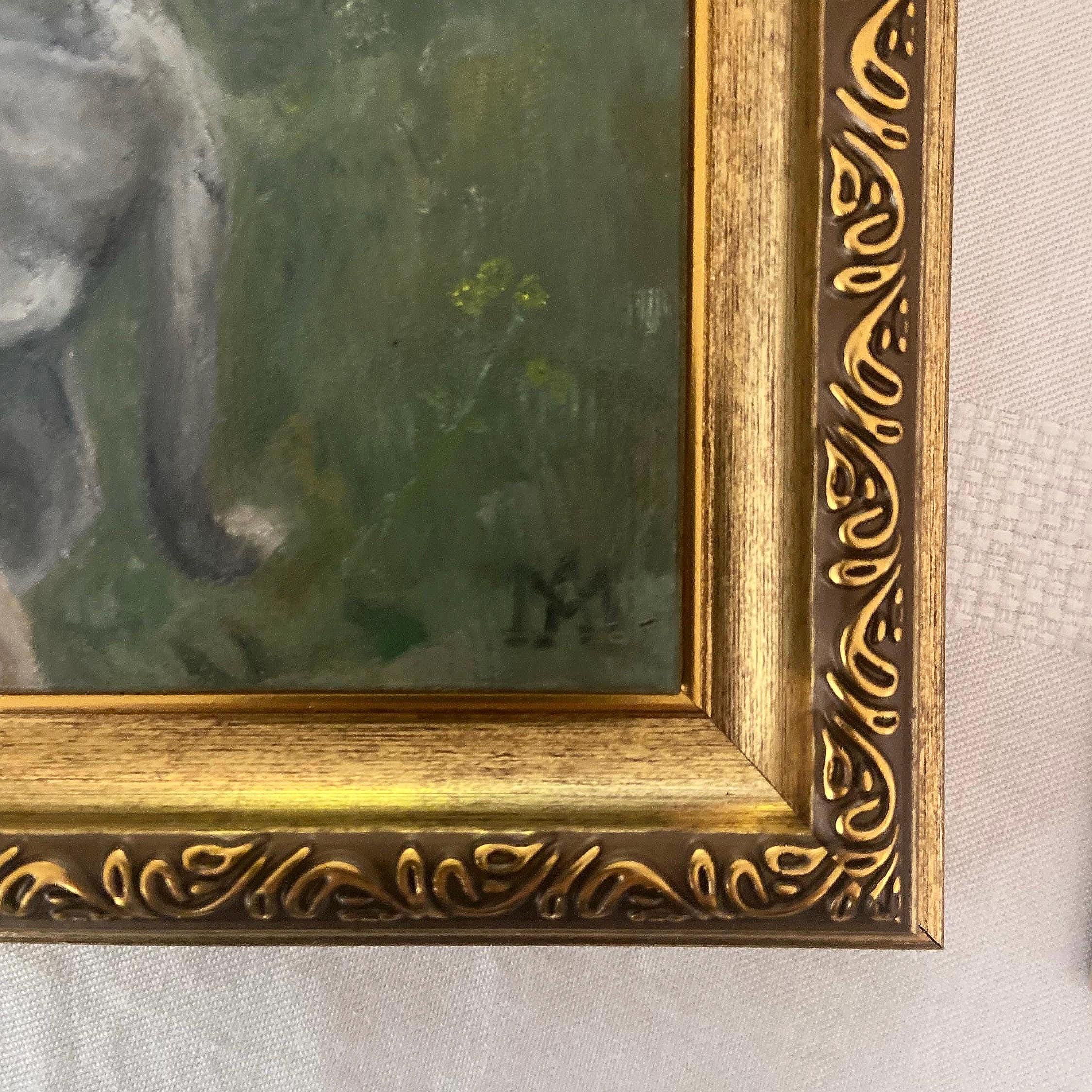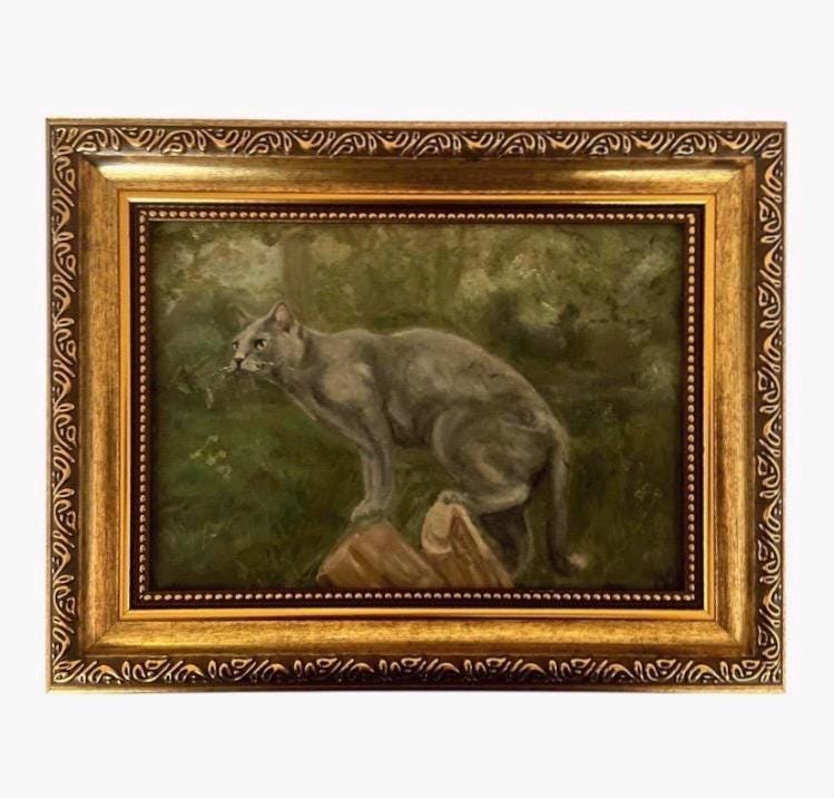 This original 5x7” oil painting on wood, titled “The Curious Cat” features a sweet cat perched on a tree stump in the middle of a quiet forest. The scene has a warm, storybook feeling. Painted with professional-grade oils on a solid wood panel, this piece has rich texture, depth, and a natural, earthy presence.